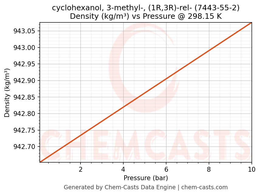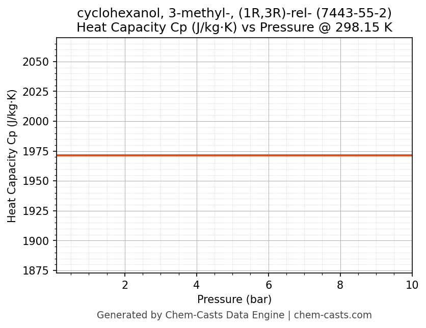 This page presents the pressure-dependent thermodynamic and transport properties of cyclohexanol, 3-methyl-, (1R,3R)-rel- (CAS 7443-55-2) calculated at a constant temperature of 298 K (25 °C) over the pressure range 0.10-10 bar.