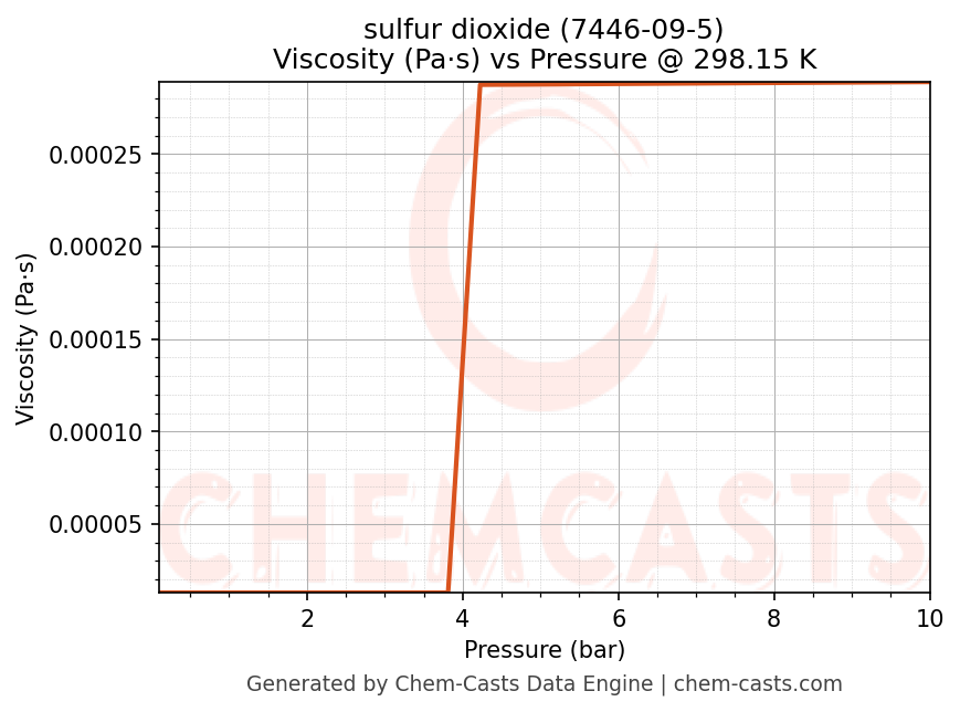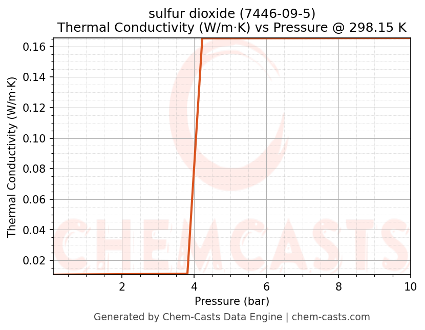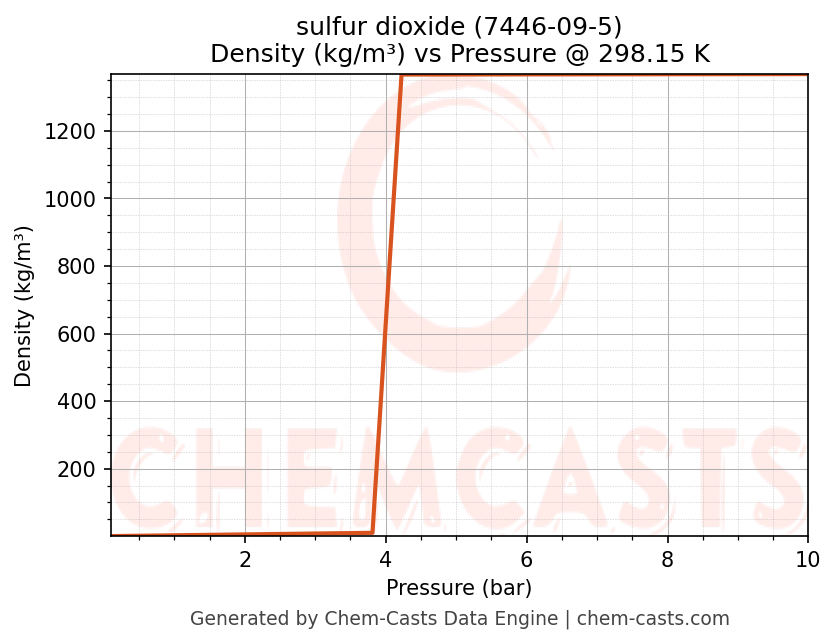 This page presents the pressure-dependent thermodynamic and transport properties of sulfur dioxide (CAS 7446-09-5) calculated at a constant temperature of 298 K (25 °C) over the pressure range 0.10-10 bar.