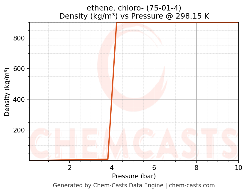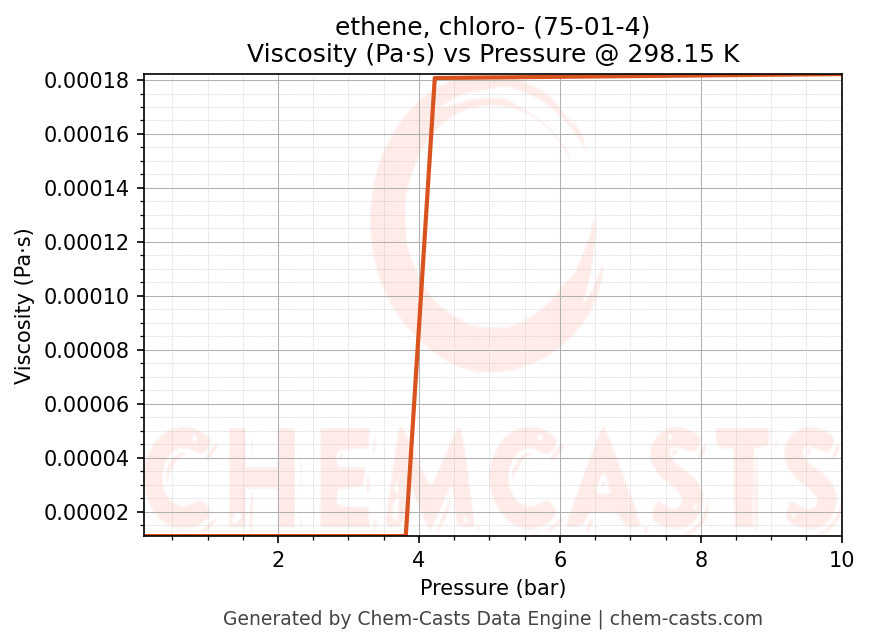 This page presents the pressure-dependent thermodynamic and transport properties of ethene, chloro- (CAS 75-01-4) calculated at a constant temperature of 298 K (25 °C) over the pressure range 0.10-10 bar.