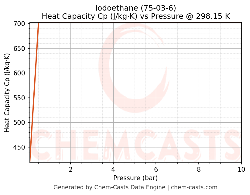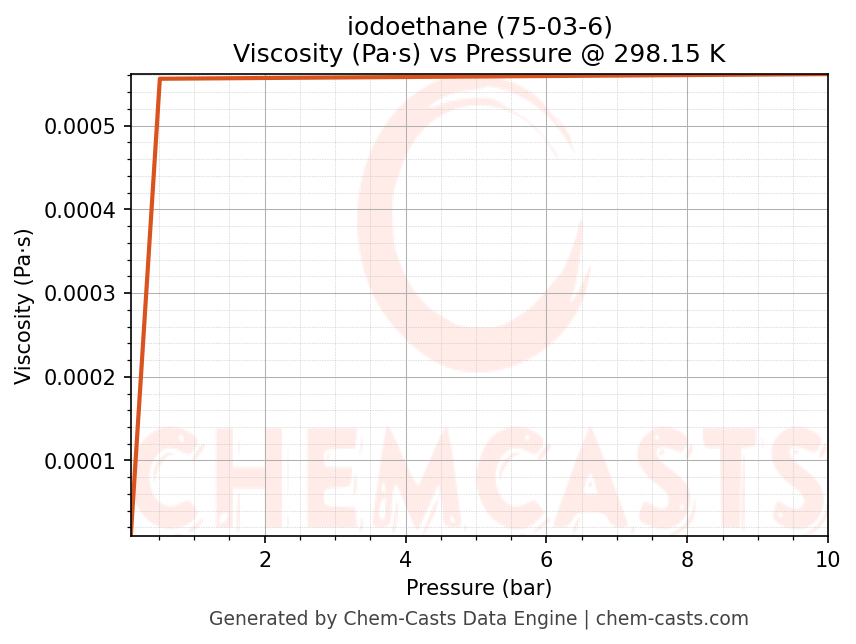 This page presents the pressure-dependent thermodynamic and transport properties of iodoethane (CAS 75-03-6) calculated at a constant temperature of 298 K (25 °C) over the pressure range 0.10-10 bar.