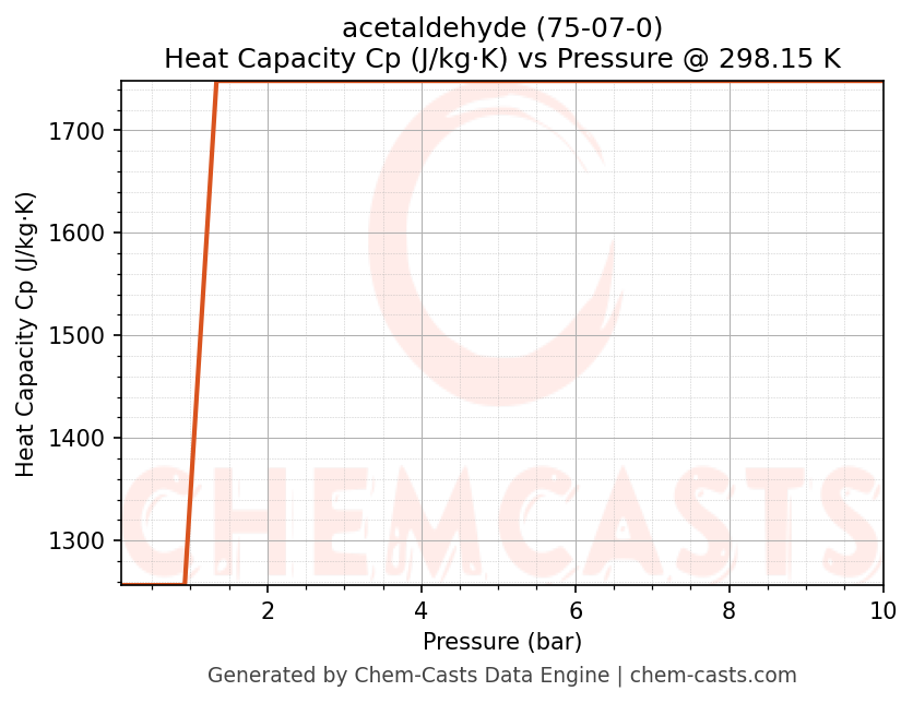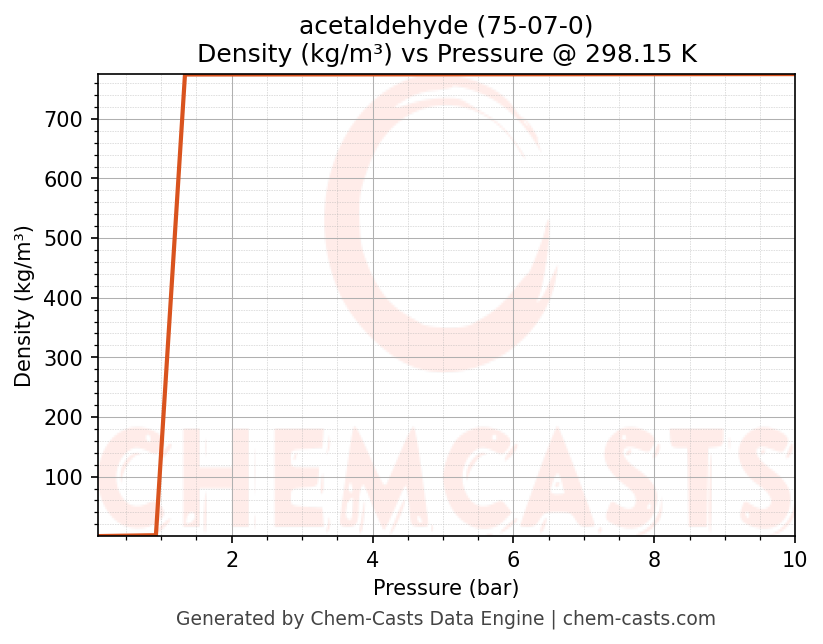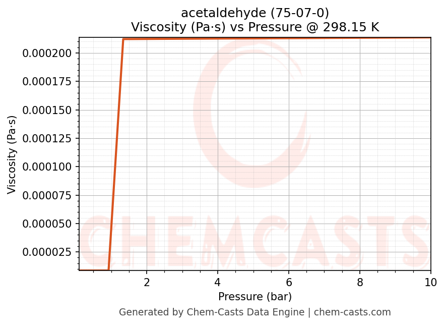 This page presents the pressure-dependent thermodynamic and transport properties of acetaldehyde (CAS 75-07-0) calculated at a constant temperature of 298 K (25 °C) over the pressure range 0.10-10 bar.