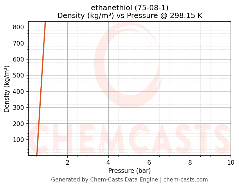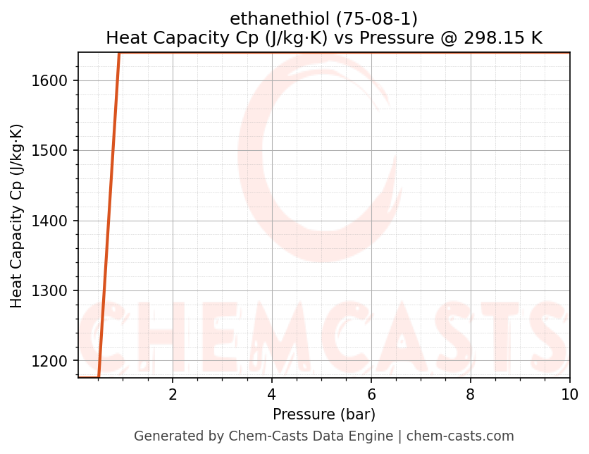 This page presents the pressure-dependent thermodynamic and transport properties of ethanethiol (CAS 75-08-1) calculated at a constant temperature of 298 K (25 °C) over the pressure range 0.10-10 bar.