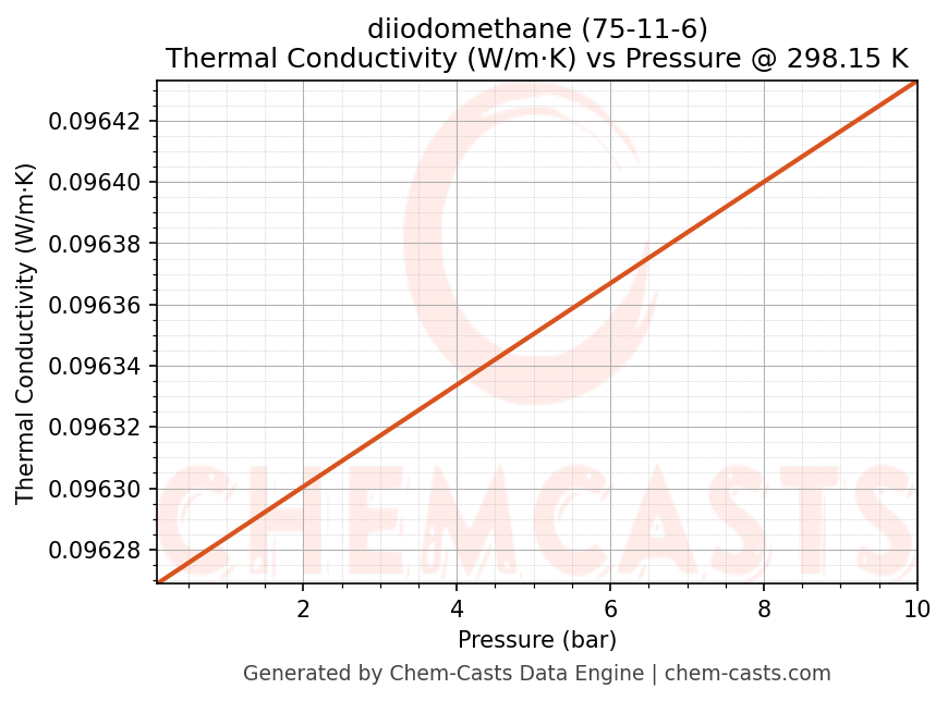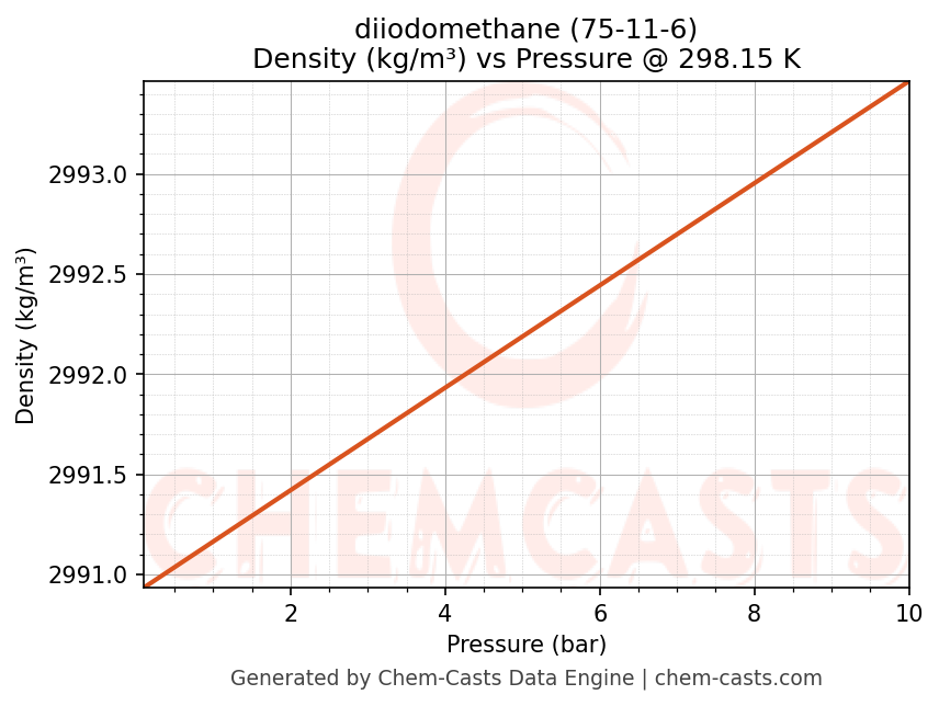This page presents the pressure-dependent thermodynamic and transport properties of diiodomethane (CAS 75-11-6) calculated at a constant temperature of 298 K (25 °C) over the pressure range 0.10-10 bar.