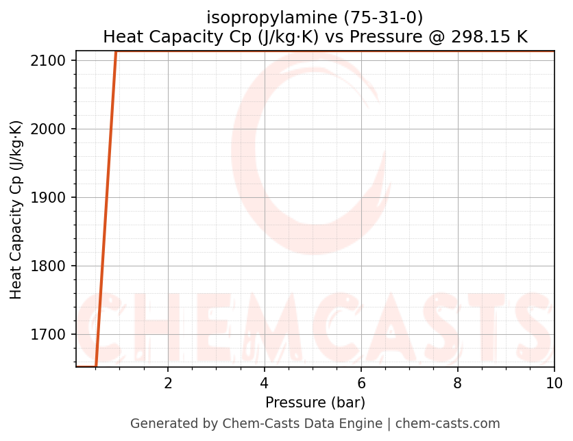 This page presents the pressure-dependent thermodynamic and transport properties of isopropylamine (CAS 75-31-0) calculated at a constant temperature of 298 K (25 °C) over the pressure range 0.10-10 bar.