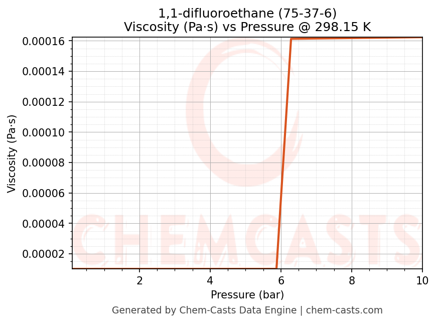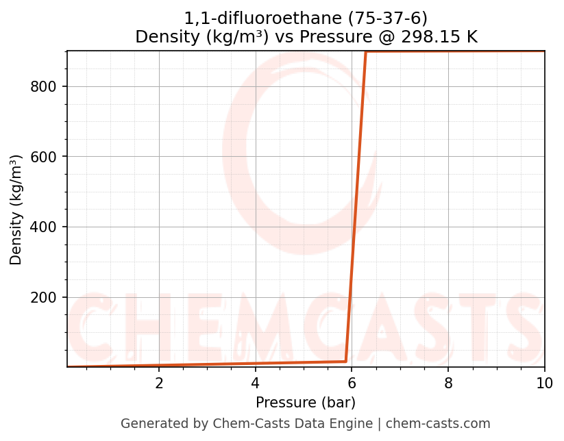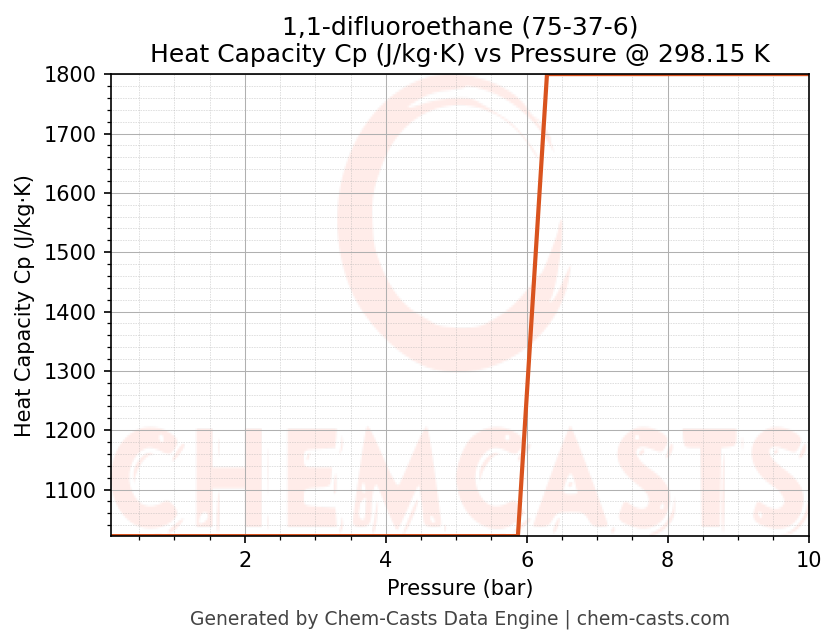This page presents the pressure-dependent thermodynamic and transport properties of 1,1-difluoroethane (CAS 75-37-6) calculated at a constant temperature of 298 K (25 °C) over the pressure range 0.10-10 bar.
