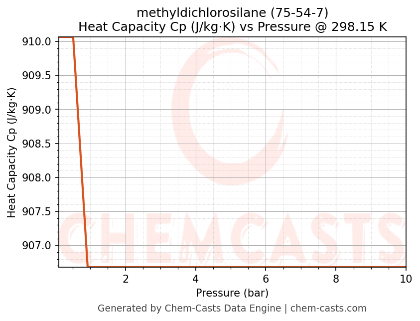 This page presents the pressure-dependent thermodynamic and transport properties of methyldichlorosilane (CAS 75-54-7) calculated at a constant temperature of 298 K (25 °C) over the pressure range 0.10-10 bar.