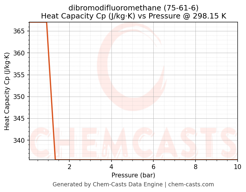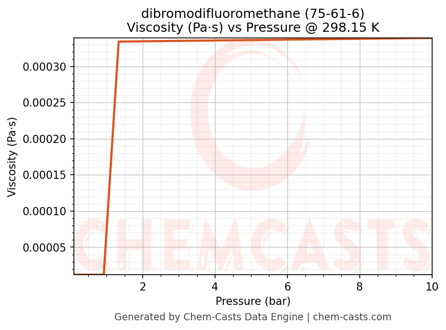 This page presents the pressure-dependent thermodynamic and transport properties of dibromodifluoromethane (CAS 75-61-6) calculated at a constant temperature of 298 K (25 °C) over the pressure range 0.10-10 bar.