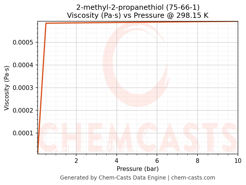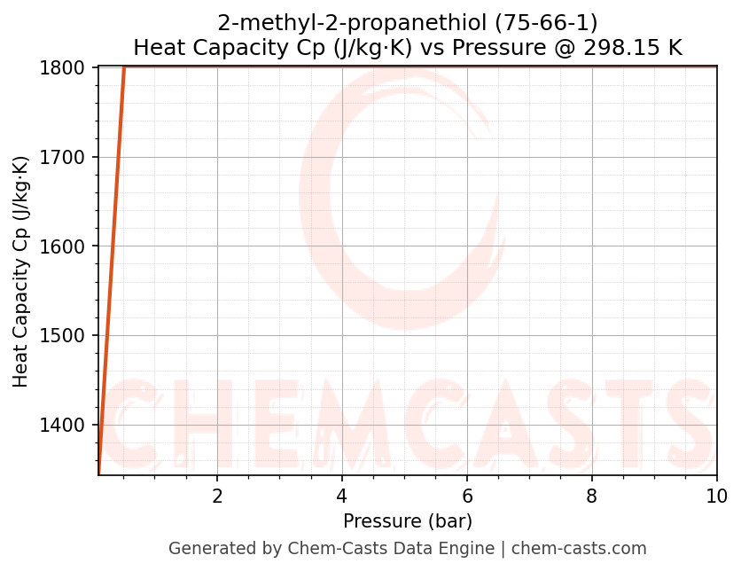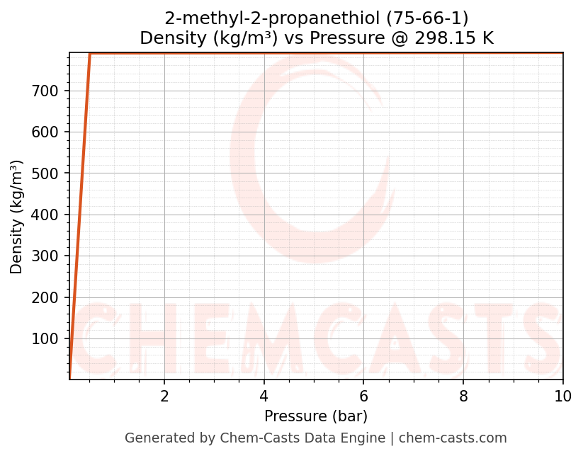 This page presents the pressure-dependent thermodynamic and transport properties of 2-methyl-2-propanethiol (CAS 75-66-1) calculated at a constant temperature of 298 K (25 °C) over the pressure range 0.10-10 bar.