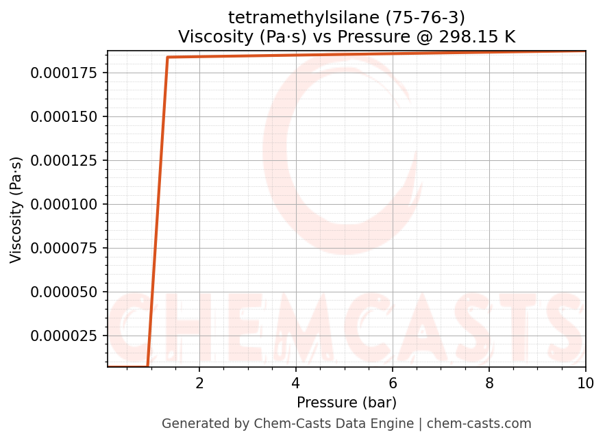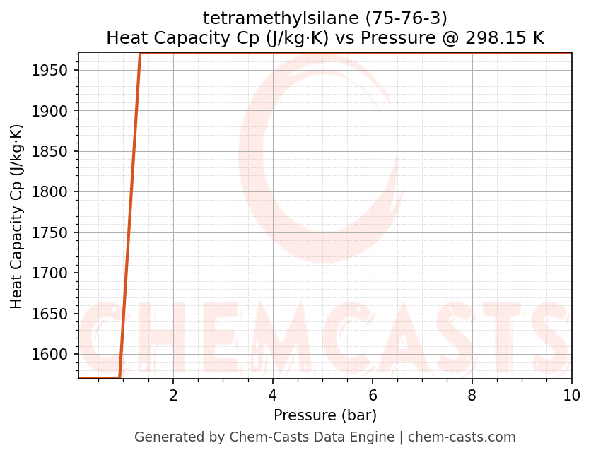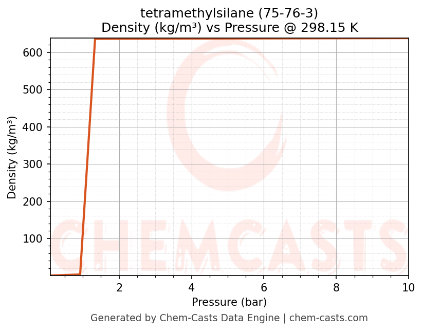 This page presents the pressure-dependent thermodynamic and transport properties of tetramethylsilane (CAS 75-76-3) calculated at a constant temperature of 298 K (25 °C) over the pressure range 0.10-10 bar.