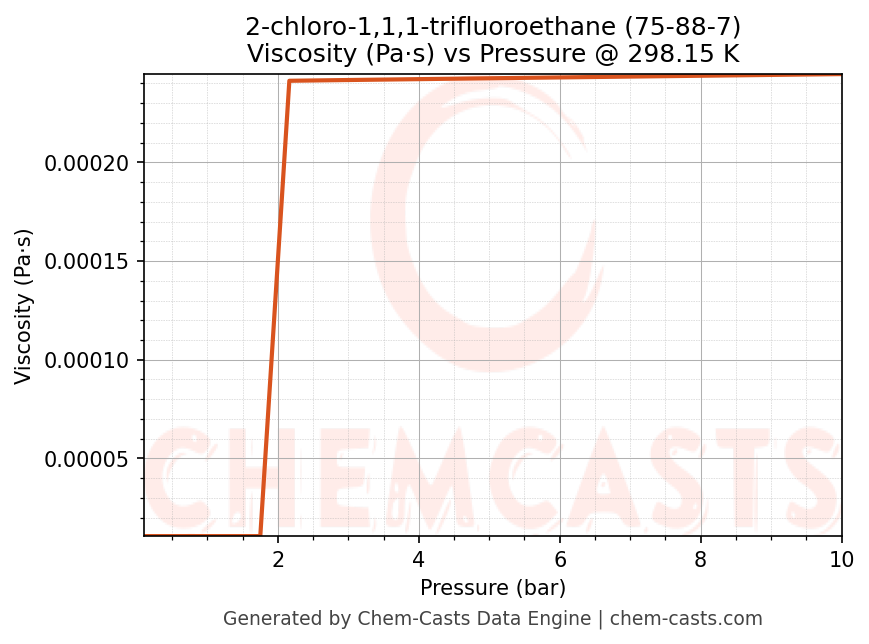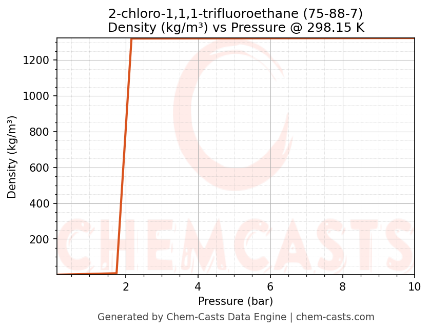 This page presents the pressure-dependent thermodynamic and transport properties of 2-chloro-1,1,1-trifluoroethane (CAS 75-88-7) calculated at a constant temperature of 298 K (25 °C) over the pressure range 0.10-10 bar.