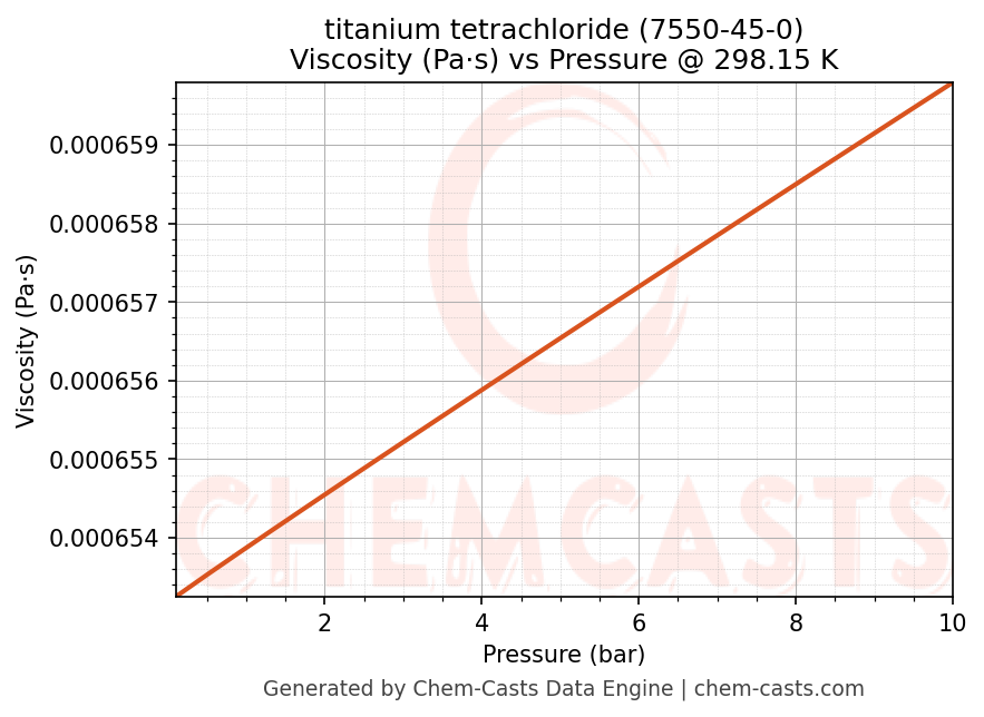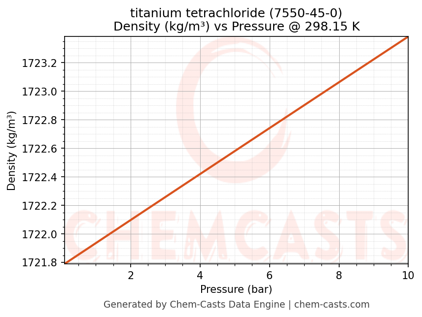 This page presents the pressure-dependent thermodynamic and transport properties of titanium tetrachloride (CAS 7550-45-0) calculated at a constant temperature of 298 K (25 °C) over the pressure range 0.10-10 bar.