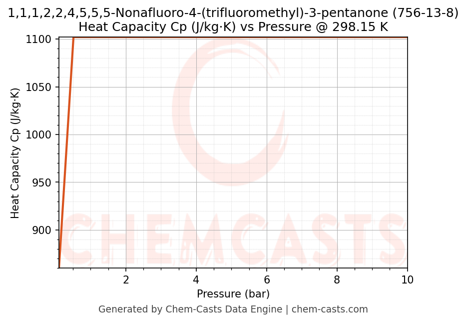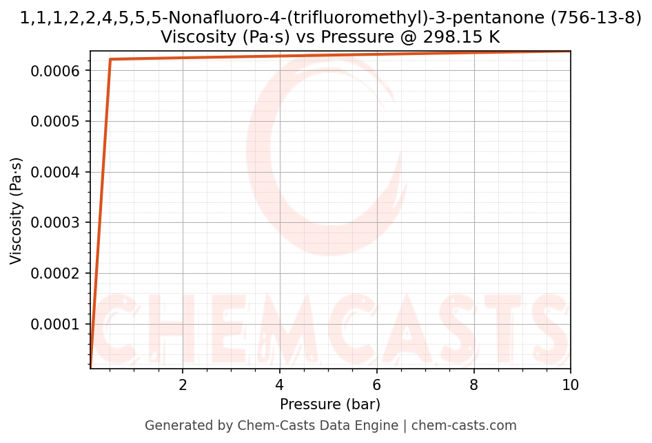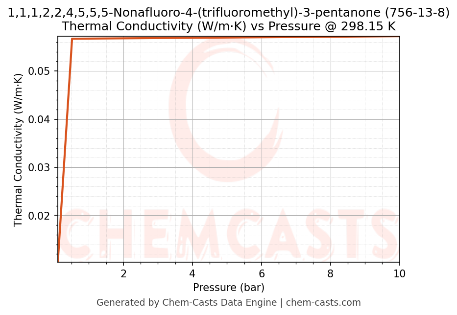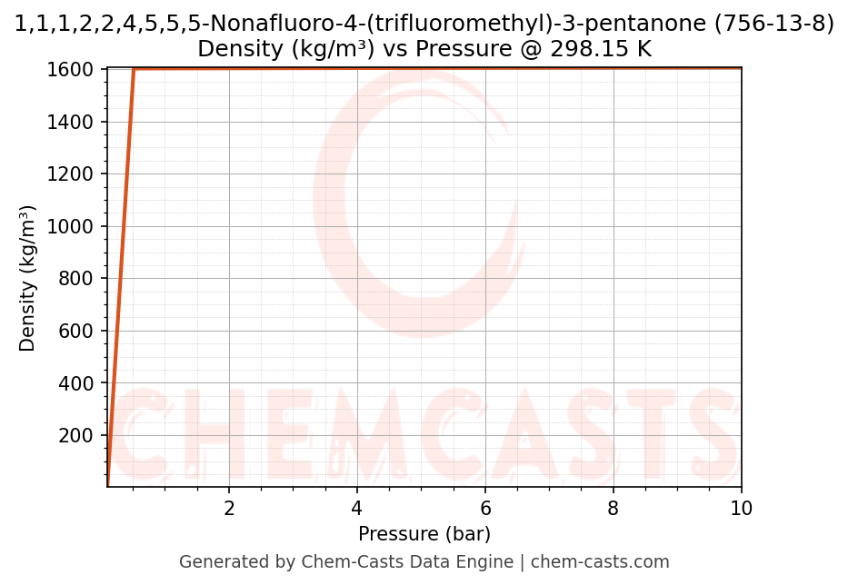 This page presents the pressure-dependent thermodynamic and transport properties of 1,1,1,2,2,4,5,5,5-Nonafluoro-4-(trifluoromethyl)-3-pentanone (CAS 756-13-8) calculated at a constant temperature of 298 K (25 °C) over the pressure range 0.10-10 bar.