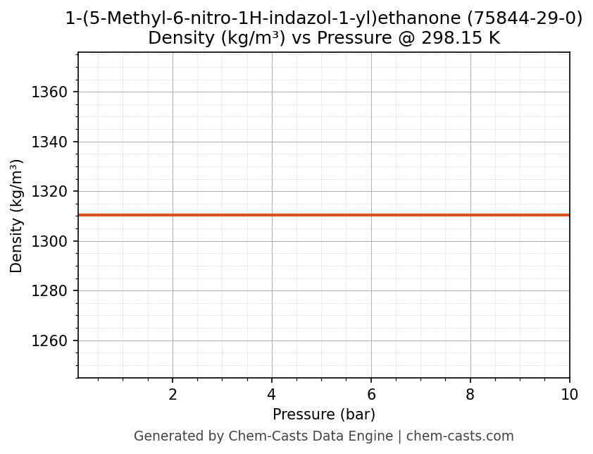 This page presents the pressure-dependent thermodynamic and transport properties of 1-(5-Methyl-6-nitro-1H-indazol-1-yl)ethanone (CAS 75844-29-0) calculated at a constant temperature of 298 K (25 °C) over the pressure range 0.10-10 bar.