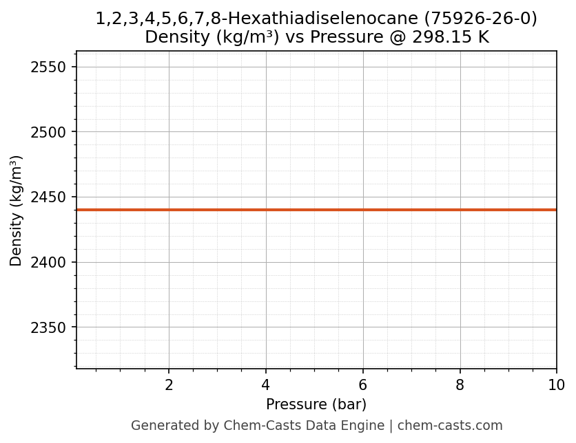 This page presents the pressure-dependent thermodynamic and transport properties of 1,2,3,4,5,6,7,8-Hexathiadiselenocane (CAS 75926-26-0) calculated at a constant temperature of 298 K (25 °C) over the pressure range 0.10-10 bar.