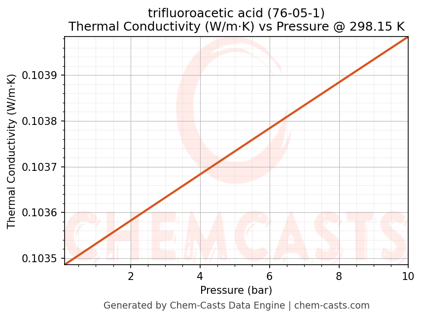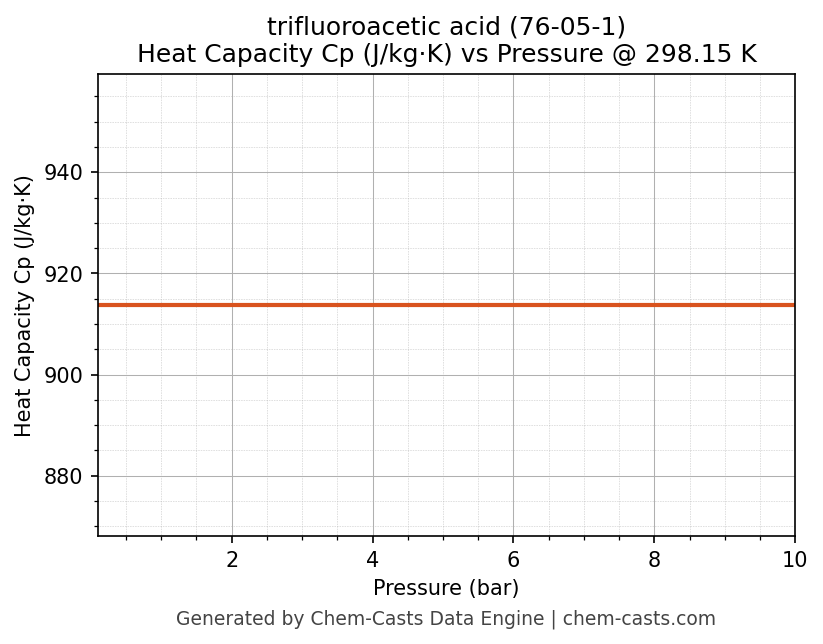 This page presents the pressure-dependent thermodynamic and transport properties of trifluoroacetic acid (CAS 76-05-1) calculated at a constant temperature of 298 K (25 °C) over the pressure range 0.10-10 bar.
