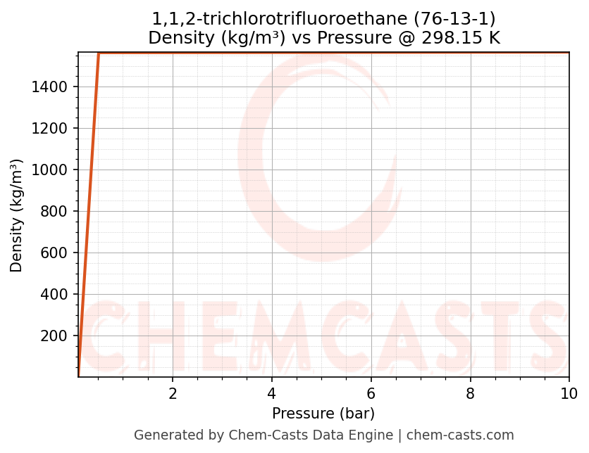 This page presents the pressure-dependent thermodynamic and transport properties of 1,1,2-trichlorotrifluoroethane (CAS 76-13-1) calculated at a constant temperature of 298 K (25 °C) over the pressure range 0.10-10 bar.