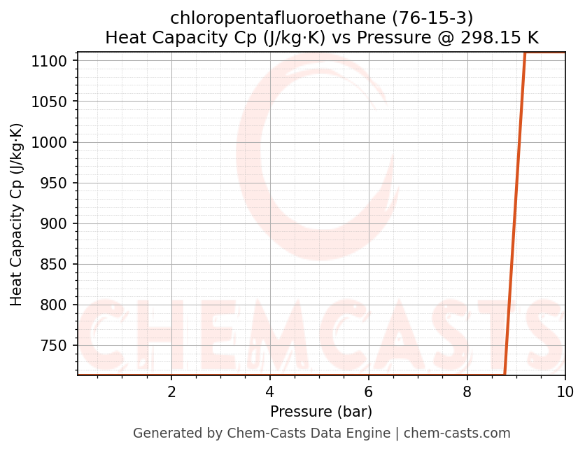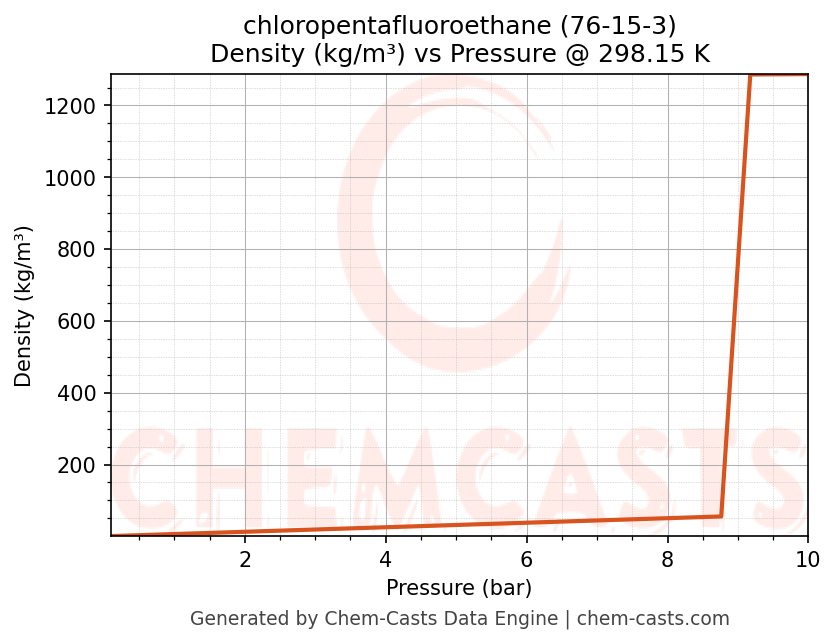 This page presents the pressure-dependent thermodynamic and transport properties of chloropentafluoroethane (CAS 76-15-3) calculated at a constant temperature of 298 K (25 °C) over the pressure range 0.10-10 bar.