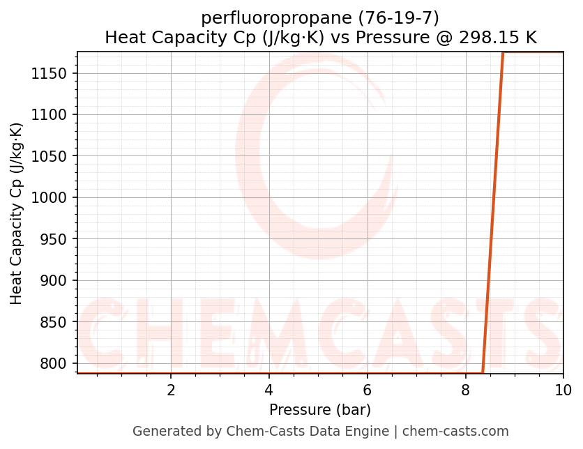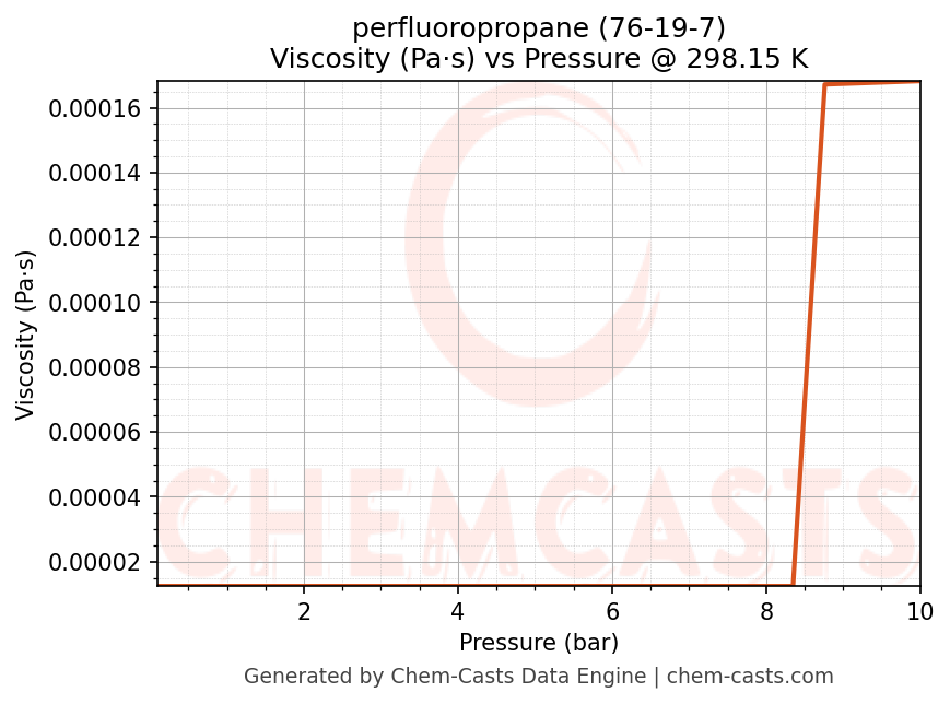 This page presents the pressure-dependent thermodynamic and transport properties of perfluoropropane (CAS 76-19-7) calculated at a constant temperature of 298 K (25 °C) over the pressure range 0.10-10 bar.