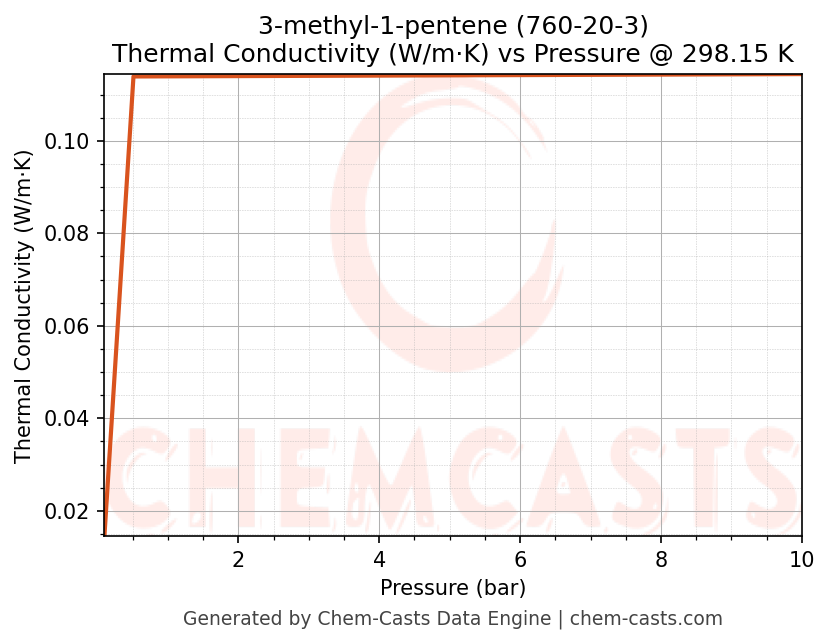 This page presents the pressure-dependent thermodynamic and transport properties of 3-methyl-1-pentene (CAS 760-20-3) calculated at a constant temperature of 298 K (25 °C) over the pressure range 0.10-10 bar.