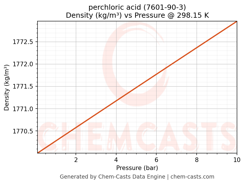 This page presents the pressure-dependent thermodynamic and transport properties of perchloric acid (CAS 7601-90-3) calculated at a constant temperature of 298 K (25 °C) over the pressure range 0.10-10 bar.