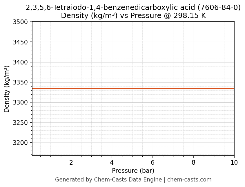 This page presents the pressure-dependent thermodynamic and transport properties of 2,3,5,6-Tetraiodo-1,4-benzenedicarboxylic acid (CAS 7606-84-0) calculated at a constant temperature of 298 K (25 °C) over the pressure range 0.10-10 bar.
