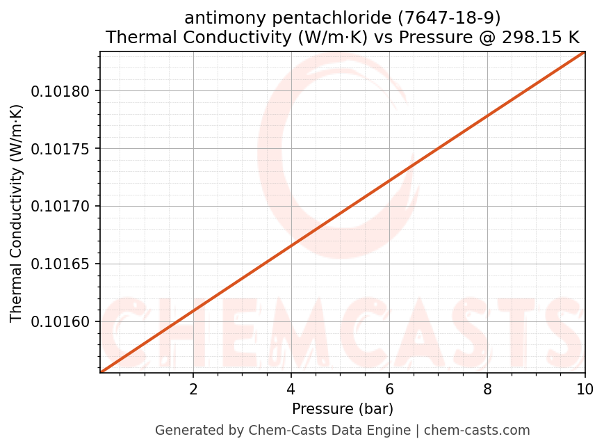 This page presents the pressure-dependent thermodynamic and transport properties of antimony pentachloride (CAS 7647-18-9) calculated at a constant temperature of 298 K (25 °C) over the pressure range 0.10-10 bar.