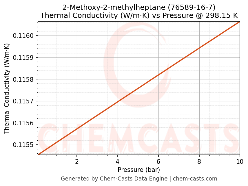 This page presents the pressure-dependent thermodynamic and transport properties of 2-Methoxy-2-methylheptane (CAS 76589-16-7) calculated at a constant temperature of 298 K (25 °C) over the pressure range 0.10-10 bar.