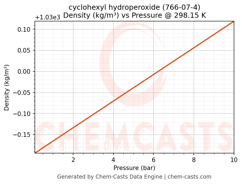 This page presents the pressure-dependent thermodynamic and transport properties of cyclohexyl hydroperoxide (CAS 766-07-4) calculated at a constant temperature of 298 K (25 °C) over the pressure range 0.10-10 bar.