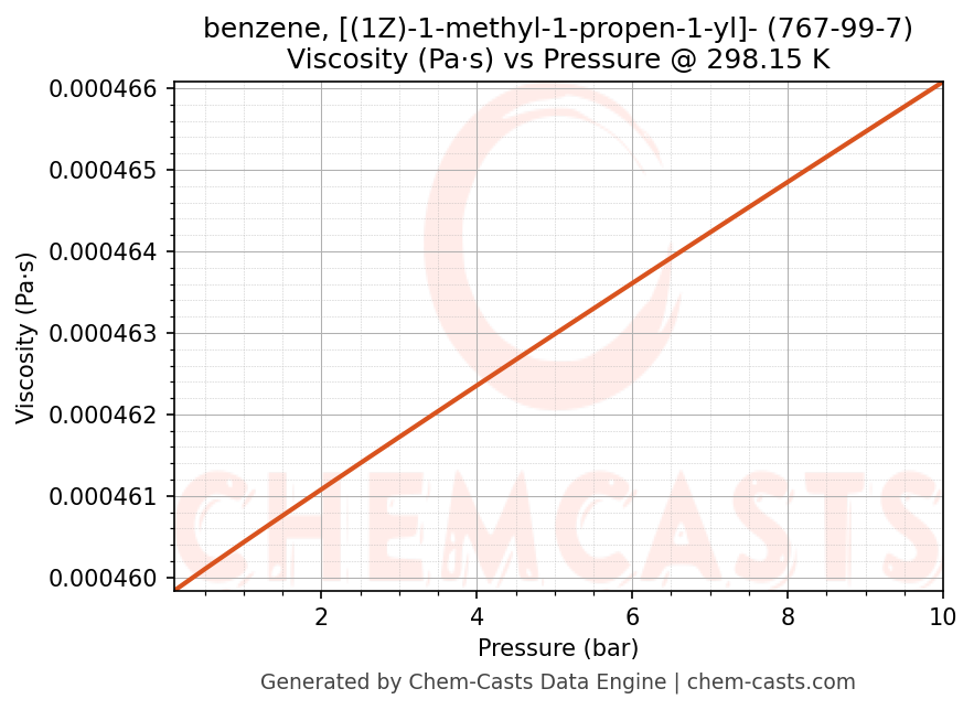 This page presents the pressure-dependent thermodynamic and transport properties of benzene, [(1Z)-1-methyl-1-propen-1-yl]- (CAS 767-99-7) calculated at a constant temperature of 298 K (25 °C) over the pressure range 0.10-10 bar.