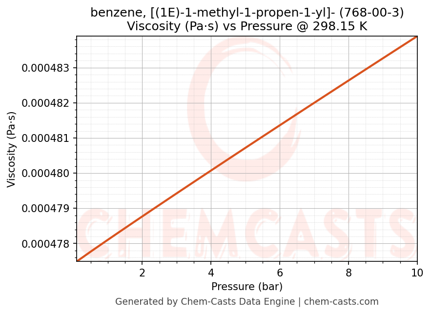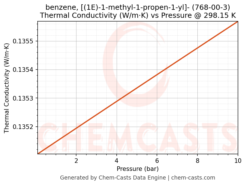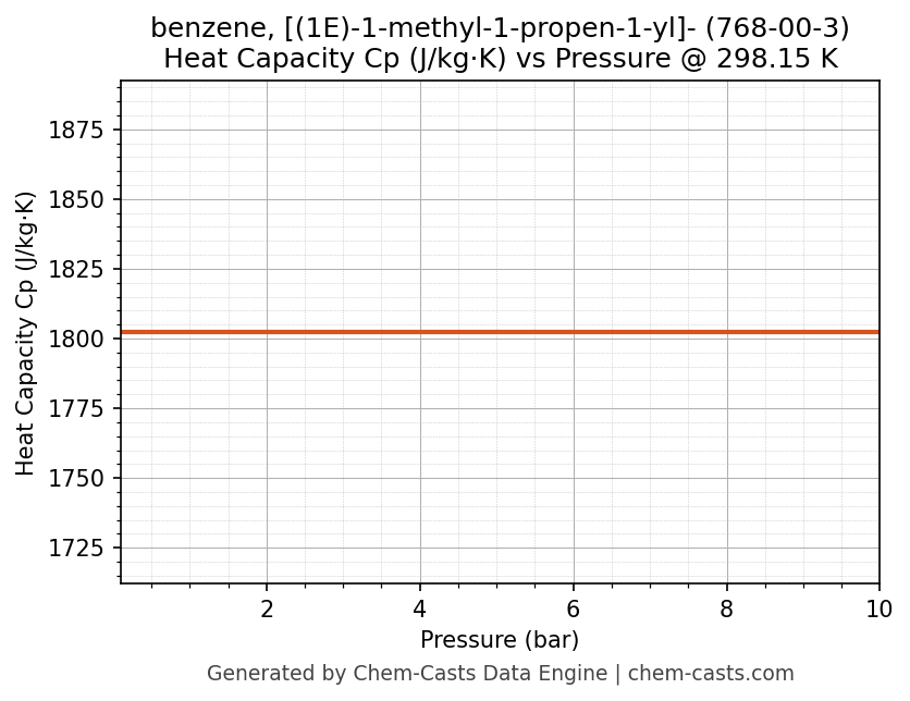 This page presents the pressure-dependent thermodynamic and transport properties of benzene, [(1E)-1-methyl-1-propen-1-yl]- (CAS 768-00-3) calculated at a constant temperature of 298 K (25 °C) over the pressure range 0.10-10 bar.