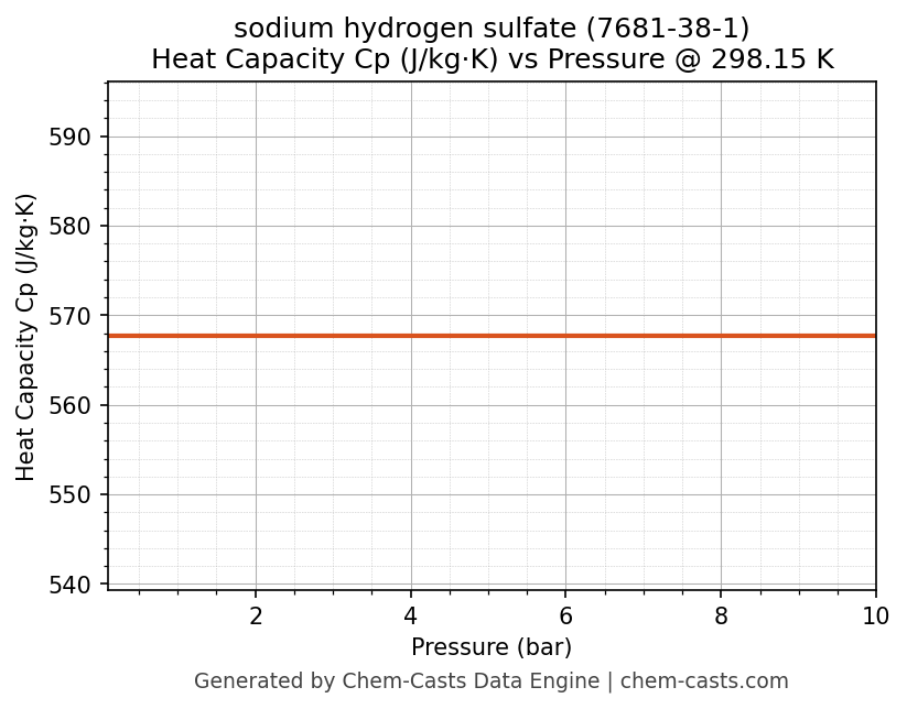 This page presents the pressure-dependent thermodynamic and transport properties of sodium hydrogen sulfate (CAS 7681-38-1) calculated at a constant temperature of 298 K (25 °C) over the pressure range 0.10-10 bar.