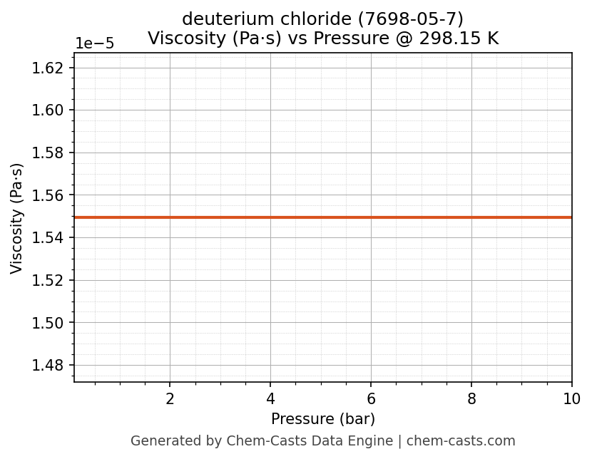 This page presents the pressure-dependent thermodynamic and transport properties of deuterium chloride (CAS 7698-05-7) calculated at a constant temperature of 298 K (25 °C) over the pressure range 0.10-10 bar.