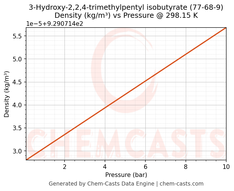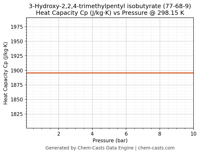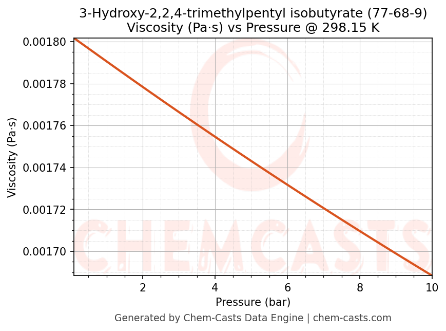 This page presents the pressure-dependent thermodynamic and transport properties of 3-Hydroxy-2,2,4-trimethylpentyl isobutyrate (CAS 77-68-9) calculated at a constant temperature of 298 K (25 °C) over the pressure range 0.10-10 bar.