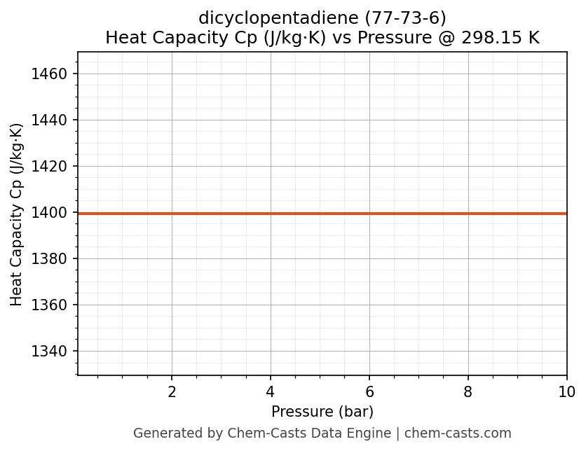 This page presents the pressure-dependent thermodynamic and transport properties of dicyclopentadiene (CAS 77-73-6) calculated at a constant temperature of 298 K (25 °C) over the pressure range 0.10-10 bar.