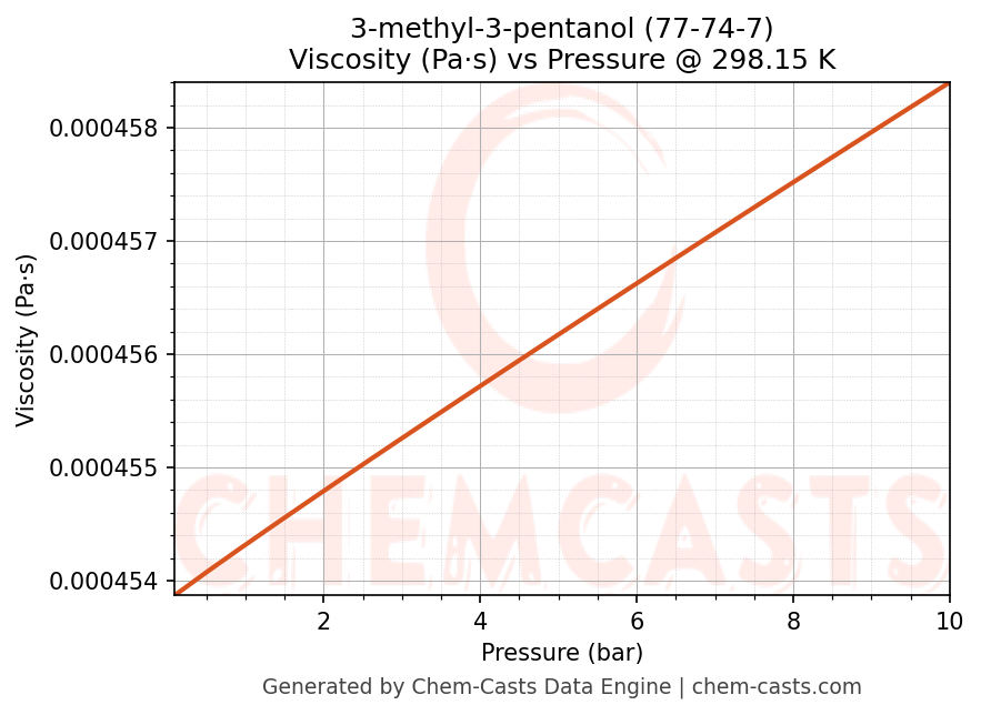 This page presents the pressure-dependent thermodynamic and transport properties of 3-methyl-3-pentanol (CAS 77-74-7) calculated at a constant temperature of 298 K (25 °C) over the pressure range 0.10-10 bar.