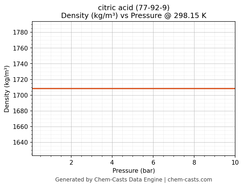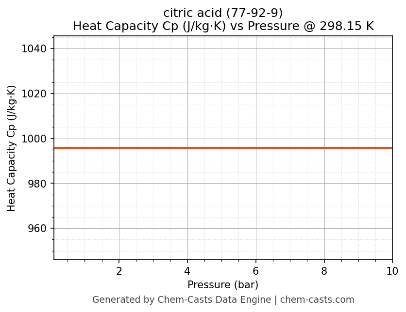 This page presents the pressure-dependent thermodynamic and transport properties of citric acid (CAS 77-92-9) calculated at a constant temperature of 298 K (25 °C) over the pressure range 0.10-10 bar.