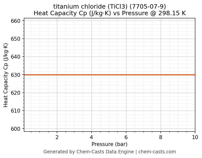 This page presents the pressure-dependent thermodynamic and transport properties of titanium chloride (TiCl3) (CAS 7705-07-9) calculated at a constant temperature of 298 K (25 °C) over the pressure range 0.10-10 bar.