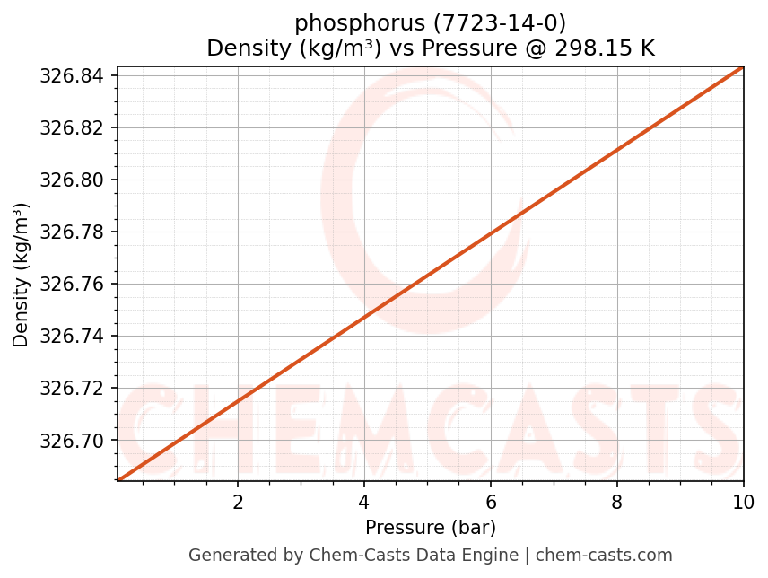 This page presents the pressure-dependent thermodynamic and transport properties of phosphorus (CAS 7723-14-0) calculated at a constant temperature of 298 K (25 °C) over the pressure range 0.10-10 bar.