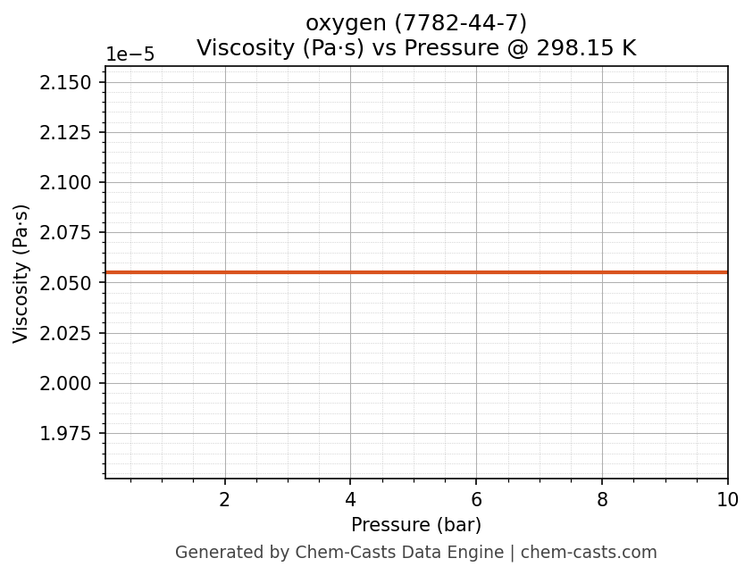 This page presents the pressure-dependent thermodynamic and transport properties of oxygen (CAS 7782-44-7) calculated at a constant temperature of 298 K (25 °C) over the pressure range 0.10-10 bar.