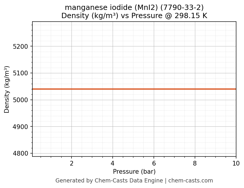 This page presents the pressure-dependent thermodynamic and transport properties of manganese iodide (MnI2) (CAS 7790-33-2) calculated at a constant temperature of 298 K (25 °C) over the pressure range 0.10-10 bar.