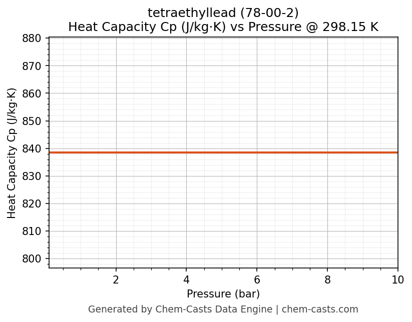 This page presents the pressure-dependent thermodynamic and transport properties of tetraethyllead (CAS 78-00-2) calculated at a constant temperature of 298 K (25 °C) over the pressure range 0.10-10 bar.