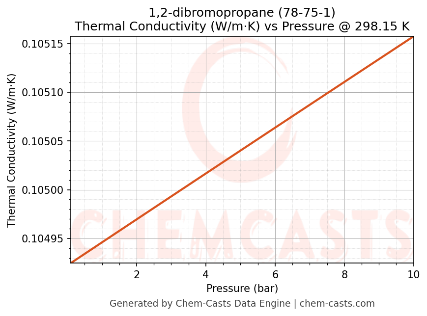 This page presents the pressure-dependent thermodynamic and transport properties of 1,2-dibromopropane (CAS 78-75-1) calculated at a constant temperature of 298 K (25 °C) over the pressure range 0.10-10 bar.