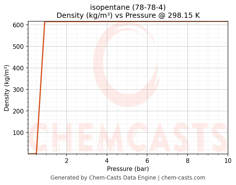 This page presents the pressure-dependent thermodynamic and transport properties of isopentane (CAS 78-78-4) calculated at a constant temperature of 298 K (25 °C) over the pressure range 0.10-10 bar.