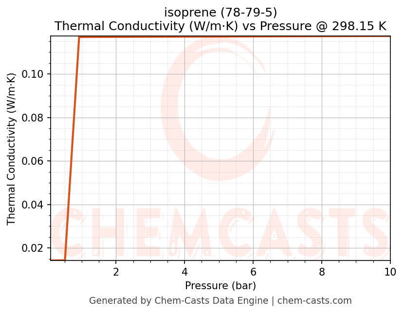 This page presents the pressure-dependent thermodynamic and transport properties of isoprene (CAS 78-79-5) calculated at a constant temperature of 298 K (25 °C) over the pressure range 0.10-10 bar.