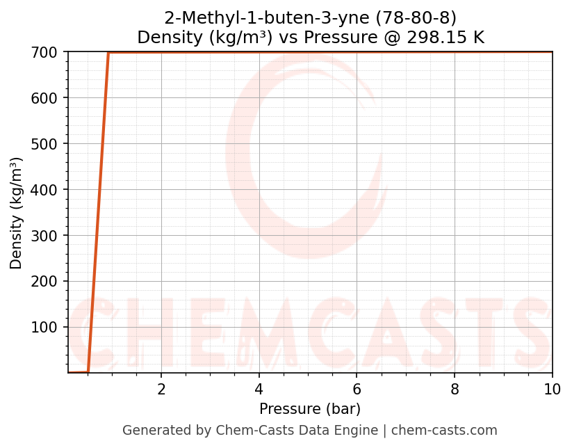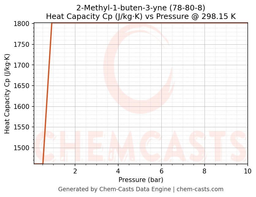This page presents the pressure-dependent thermodynamic and transport properties of 2-Methyl-1-buten-3-yne (CAS 78-80-8) calculated at a constant temperature of 298 K (25 °C) over the pressure range 0.10-10 bar.