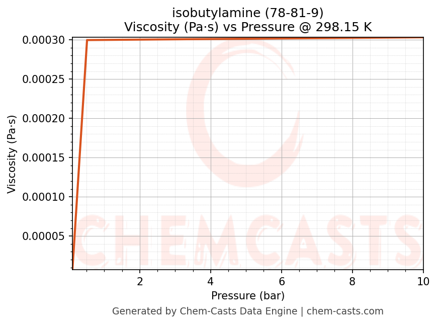 This page presents the pressure-dependent thermodynamic and transport properties of isobutylamine (CAS 78-81-9) calculated at a constant temperature of 298 K (25 °C) over the pressure range 0.10-10 bar.
