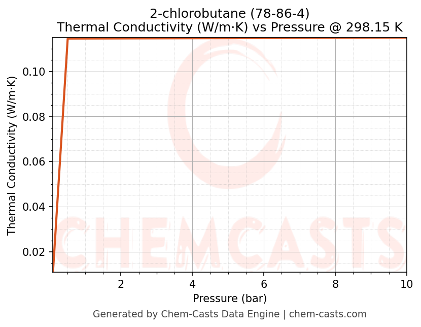 This page presents the pressure-dependent thermodynamic and transport properties of 2-chlorobutane (CAS 78-86-4) calculated at a constant temperature of 298 K (25 °C) over the pressure range 0.10-10 bar.