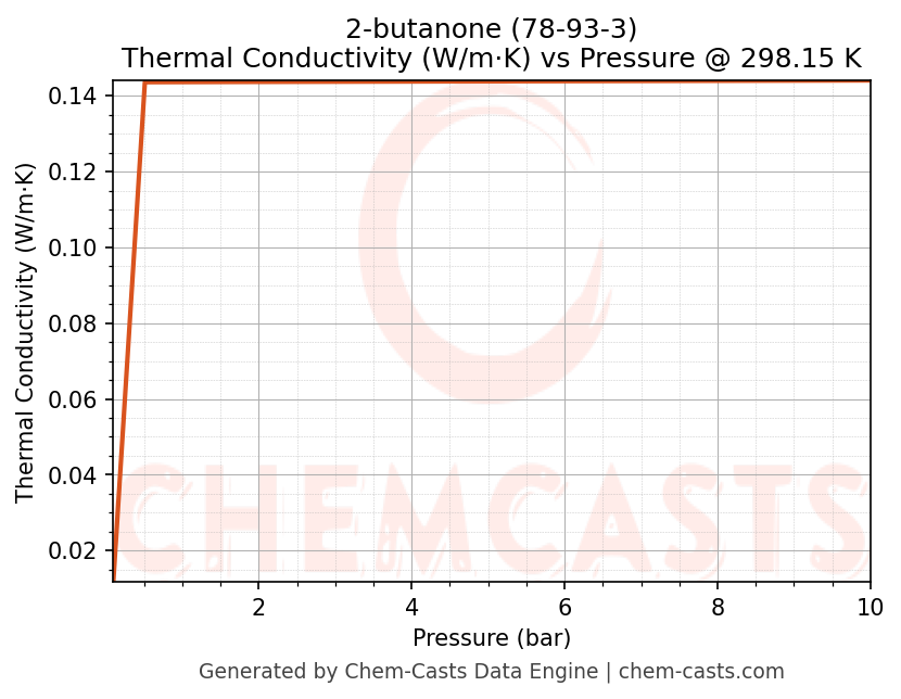 This page presents the pressure-dependent thermodynamic and transport properties of 2-butanone (CAS 78-93-3) calculated at a constant temperature of 298 K (25 °C) over the pressure range 0.10-10 bar.