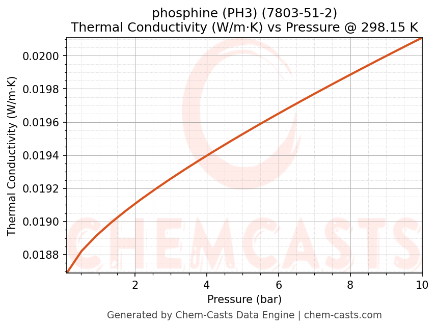 This page presents the pressure-dependent thermodynamic and transport properties of phosphine (PH3) (CAS 7803-51-2) calculated at a constant temperature of 298 K (25 °C) over the pressure range 0.10-10 bar.