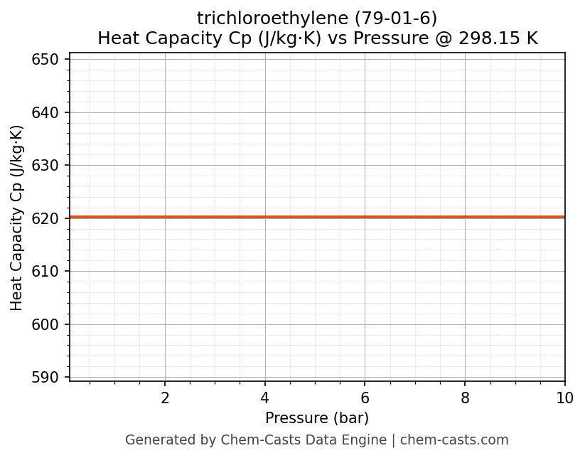 This page presents the pressure-dependent thermodynamic and transport properties of trichloroethylene (CAS 79-01-6) calculated at a constant temperature of 298 K (25 °C) over the pressure range 0.10-10 bar.